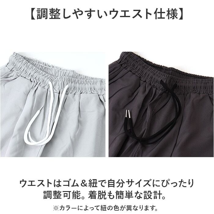・ウエストはゴム&紐で自分サイズにぴったり調整可能。着脱も簡単な設計。
