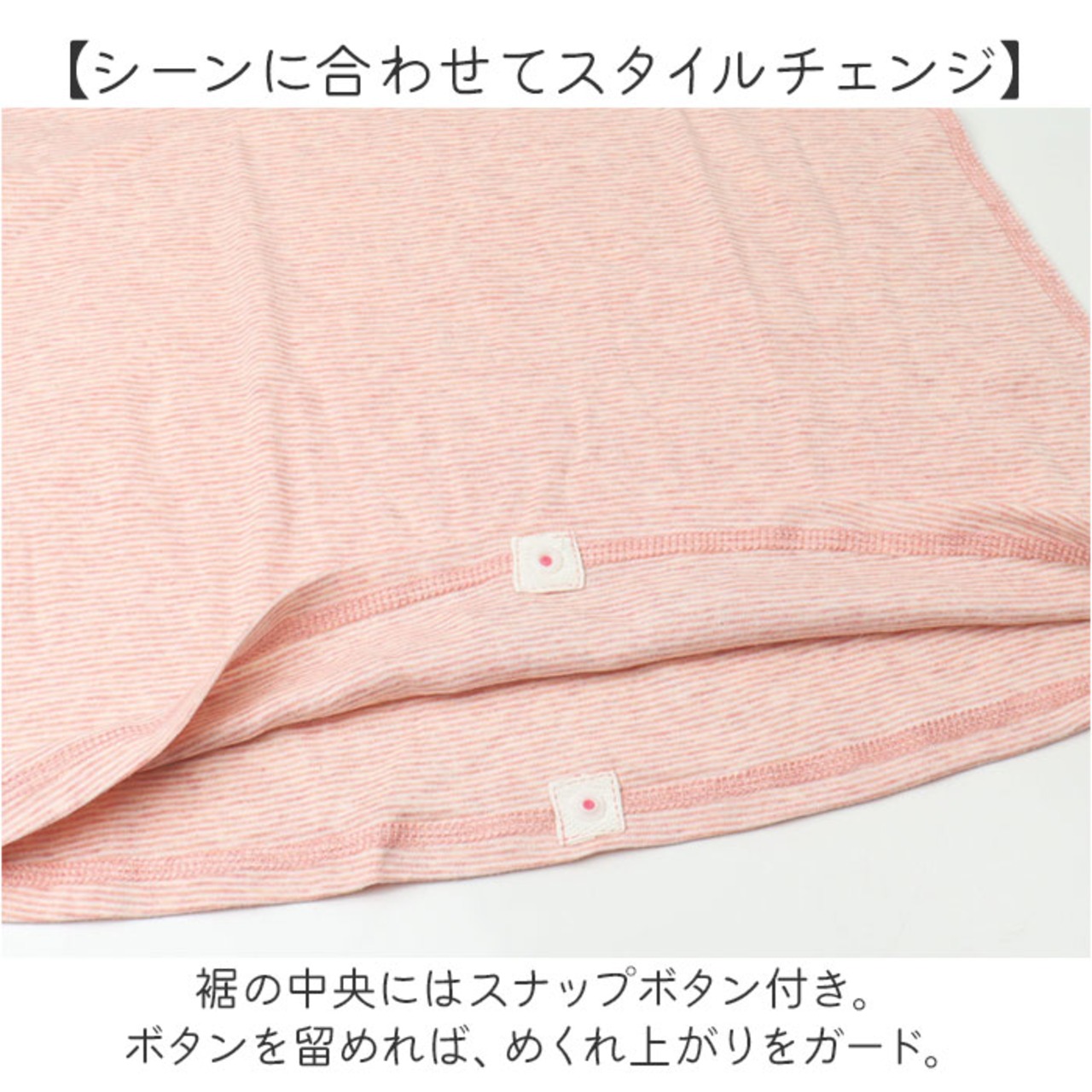 ・裾の中央にはスナップボタン付き。ボタンを留めれば、めくれ上がりをガード。