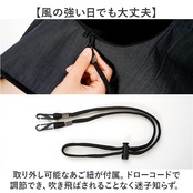 ・取り外し可能なあご紐が付属。ドローコードで調節でき、吹き飛ばされることなく迷子知らず。