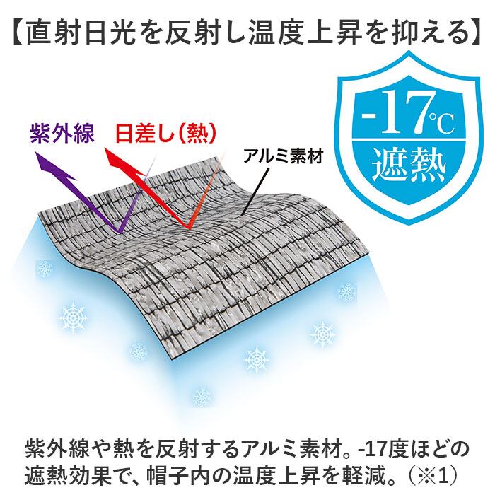 ・紫外線や熱を反射するアルミ素材。-17度ほどの遮熱効果で、帽子内の温度上昇を軽減。