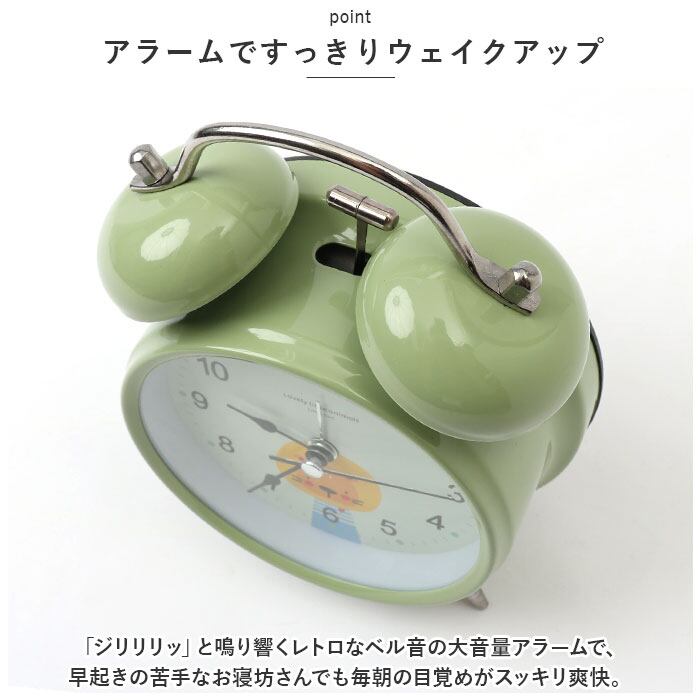 ・「ジリリリッ」と鳴り響くレトロなベル音の大音量アラームで、早起きの苦手なお寝坊さんでも毎朝の目覚めがスッキリ爽快。(※アラーム時刻設定用の目盛りは12分単位になります。アラーム設定をする際にお気をつけください。)