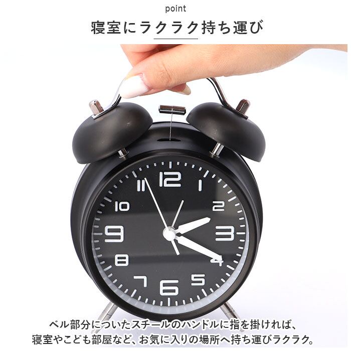・「ジリリリッ」と鳴り響くレトロなベル音の大音量アラームで、早起きの苦手なお寝坊さんでも毎朝の目覚めがスッキリ爽快。(※アラーム時刻設定用の目盛りは12分単位になります。アラーム設定をする際にお気をつけください。)