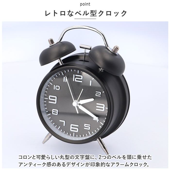 ・コロンと可愛らしい丸型の文字盤に、2つのベルを頭に乗せたアンティーク感のあるデザインが印象的なアラームクロック。