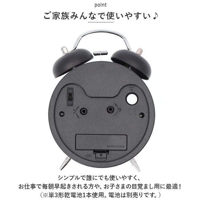 ・シンプルで誰にでも使いやすく、お仕事で毎朝早起きされる方や、お子さまの目覚まし用に最適!(※単3形乾電池1本使用。電池は別売りです。)