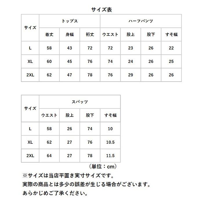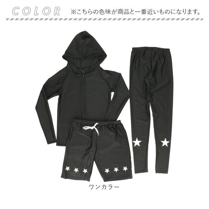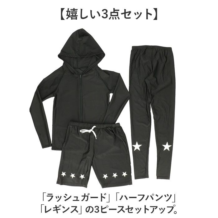 「ラッシュガード」「ハーフパンツ」「レギンス」の3ピースセットアップ。