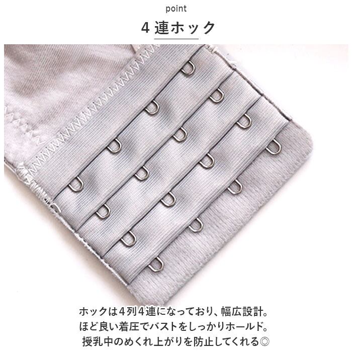 ・ホックは4列4連になっており、幅広設計。ほど良い着圧でバストをしっかりホールド。授乳中のめくれ上がりを防止してくれる◎