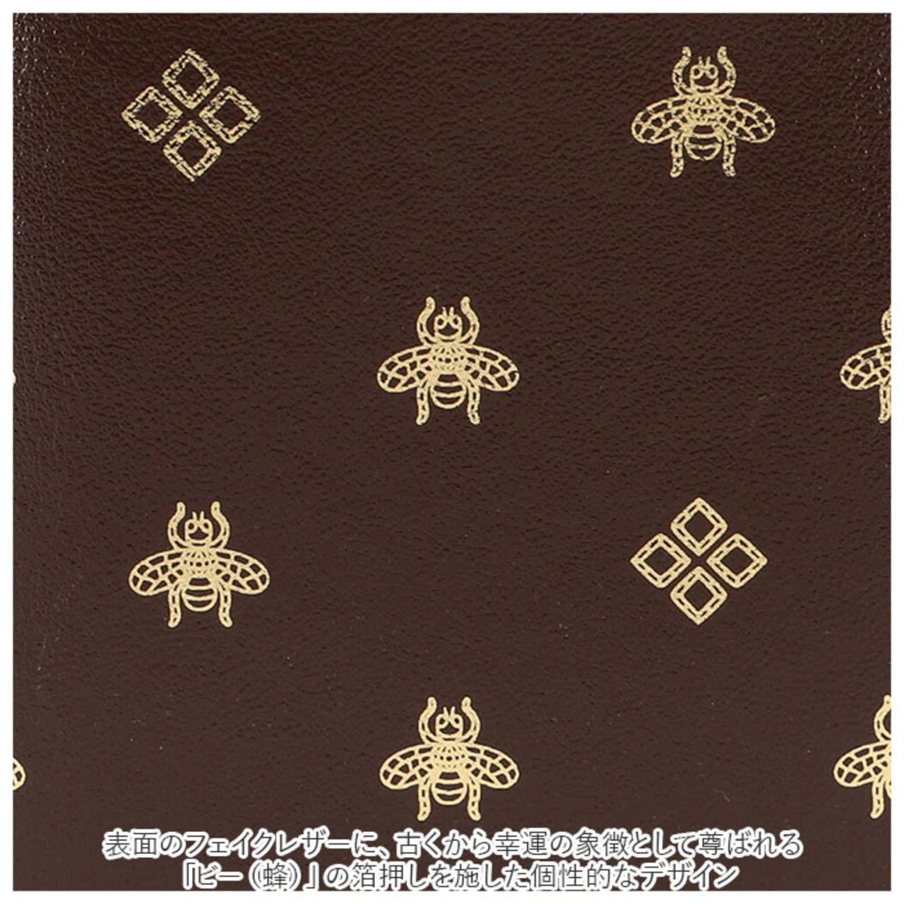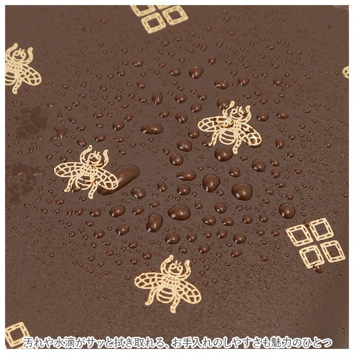 ・表面のフェイクレザーに、古くから幸運の象徴として尊ばれる「ビー(蜂)」の箔押しを施した個性的なデザイン。汚れが水滴がサッと拭き取れる、お手入れのしやすさも魅力のひとつ。