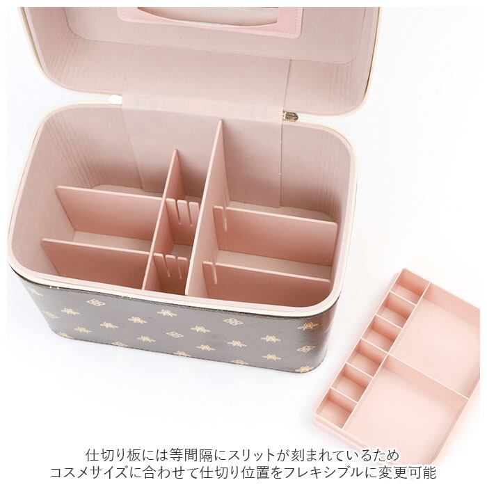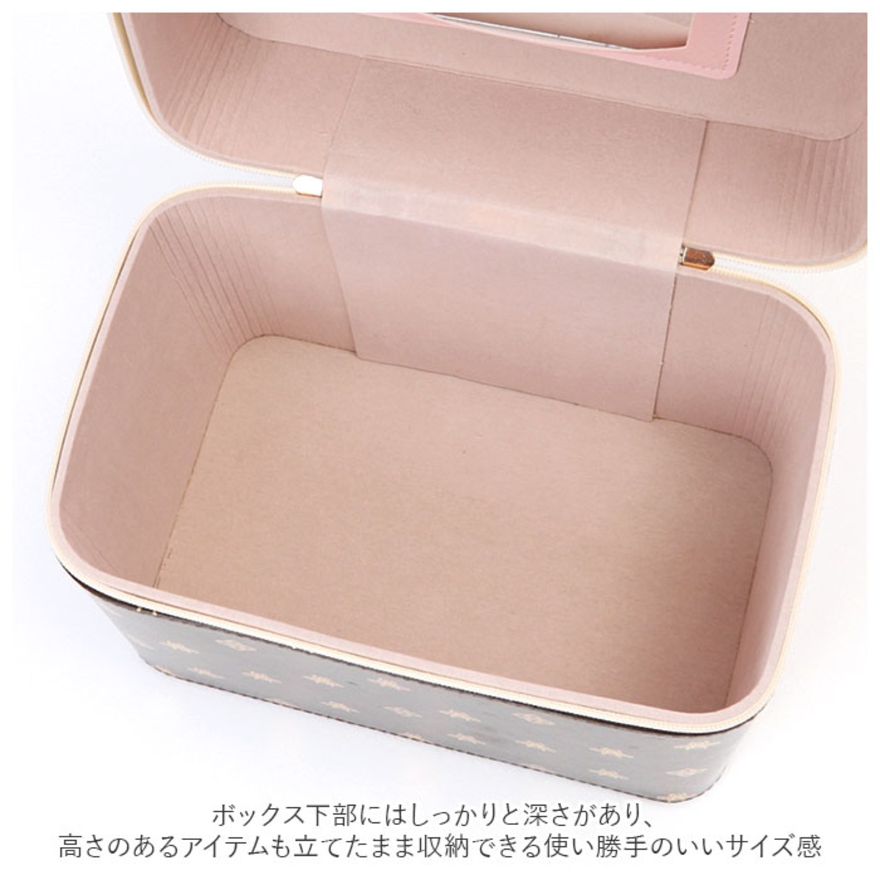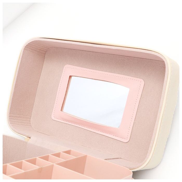 ※開口部フタは大きく開くダブルファスナー式。フタ裏には便利なミラー付きなので、一人暮らしのお部屋でも、このコスメボックスを広げればどこでもドレッサーに早変わり!