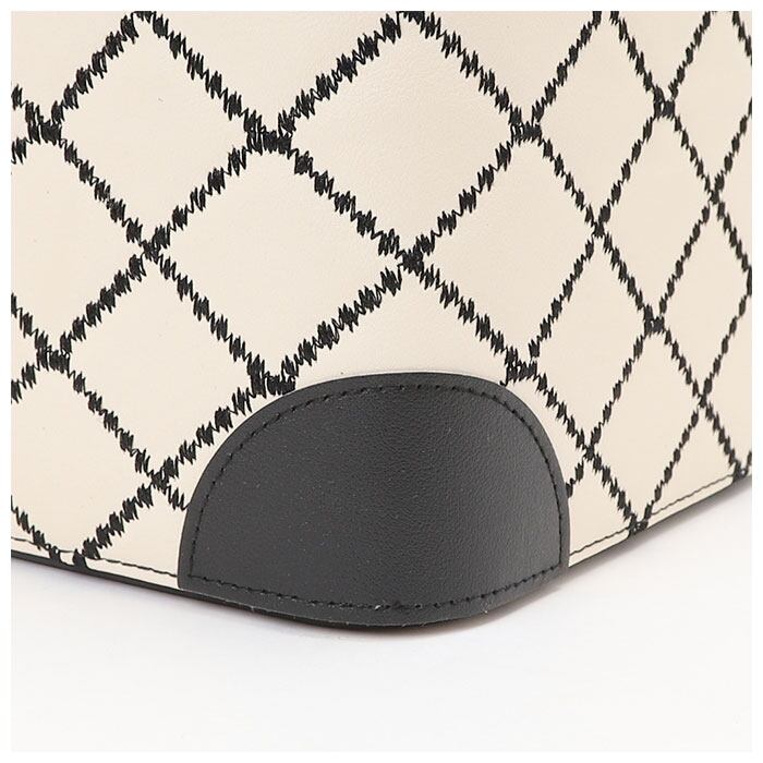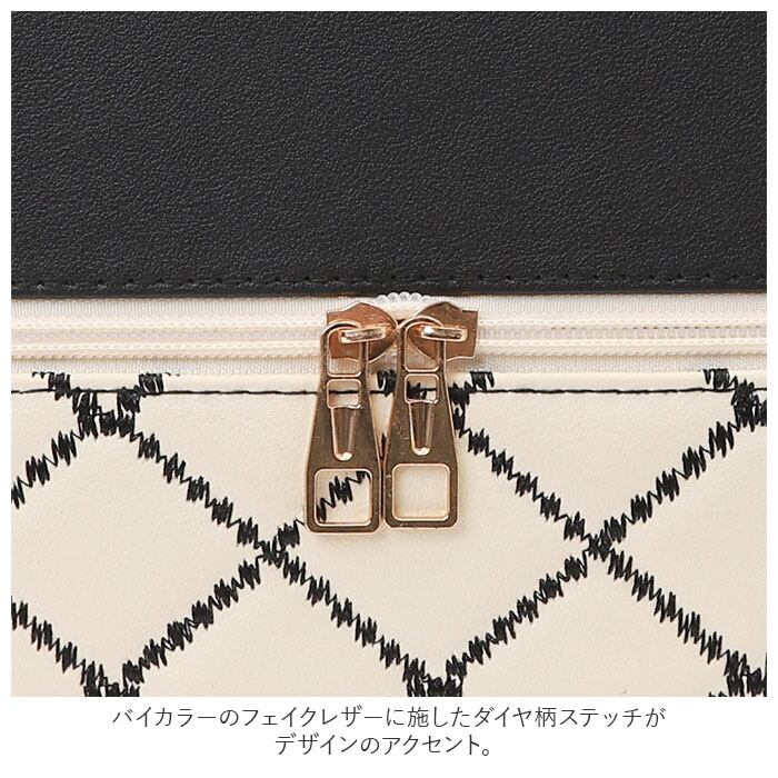 ・バイカラーのフェイクレザーに施したダイヤ柄ステッチがデザインのアクセント。汚れや水滴がサッと拭き取れる、お手入れのしやすさも魅力のひとつ。