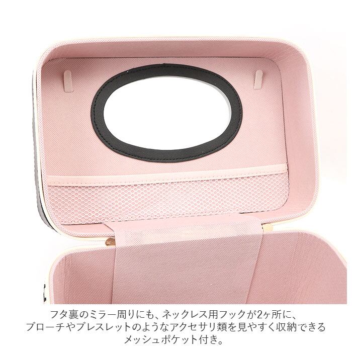 ・フタ裏のミラー周りにも、ネックレス用フックが2ヶ所に、ブローチやブレスレットのようなアクセサリ類を見やすく収納できるメッシュポケット付き。