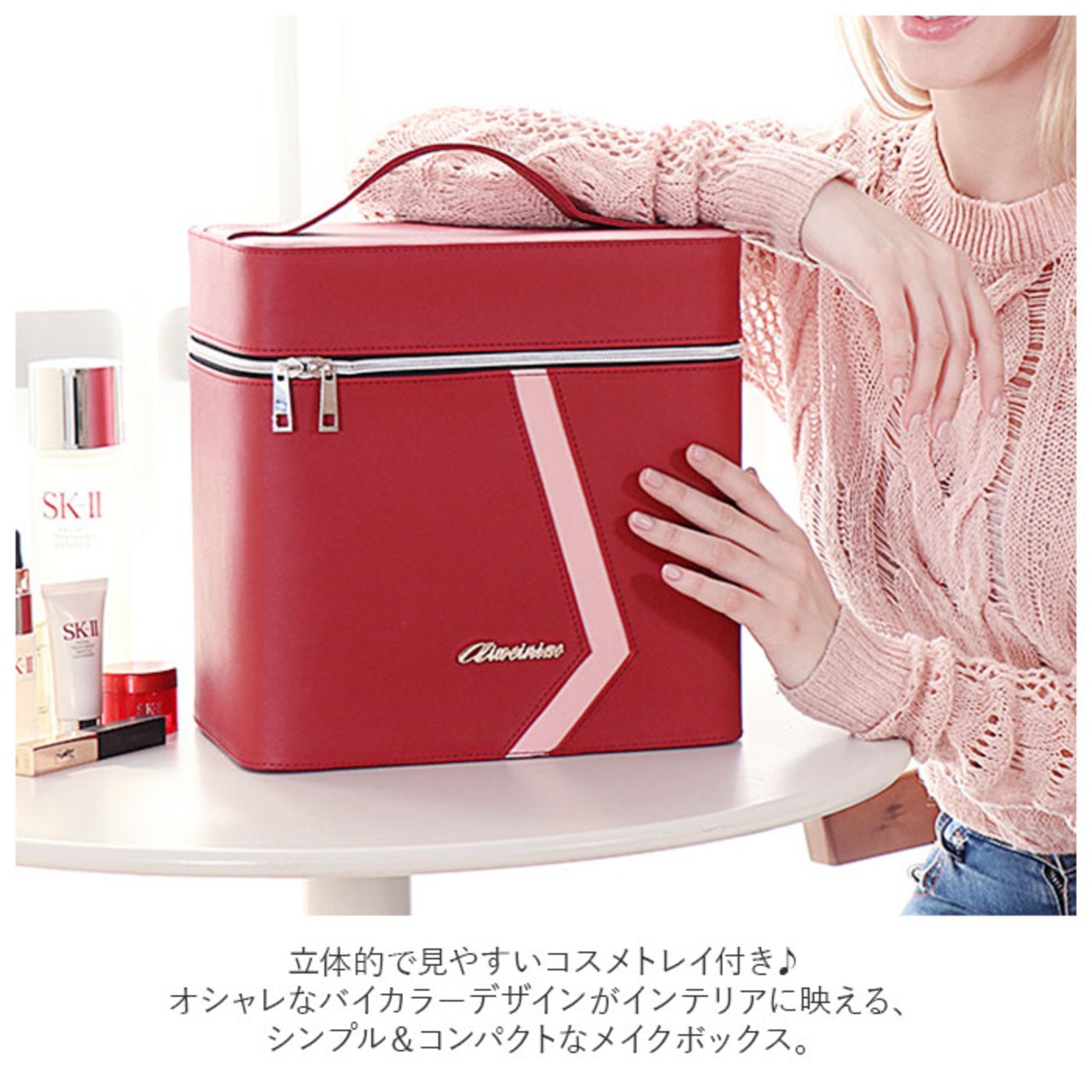 ・立体的で見やすいコスメトレイ付き♪オシャレなバイカラーデザインがインテリアに映える、シンプル&コンパクトなメイクボックス。
