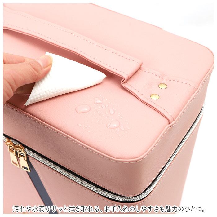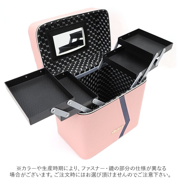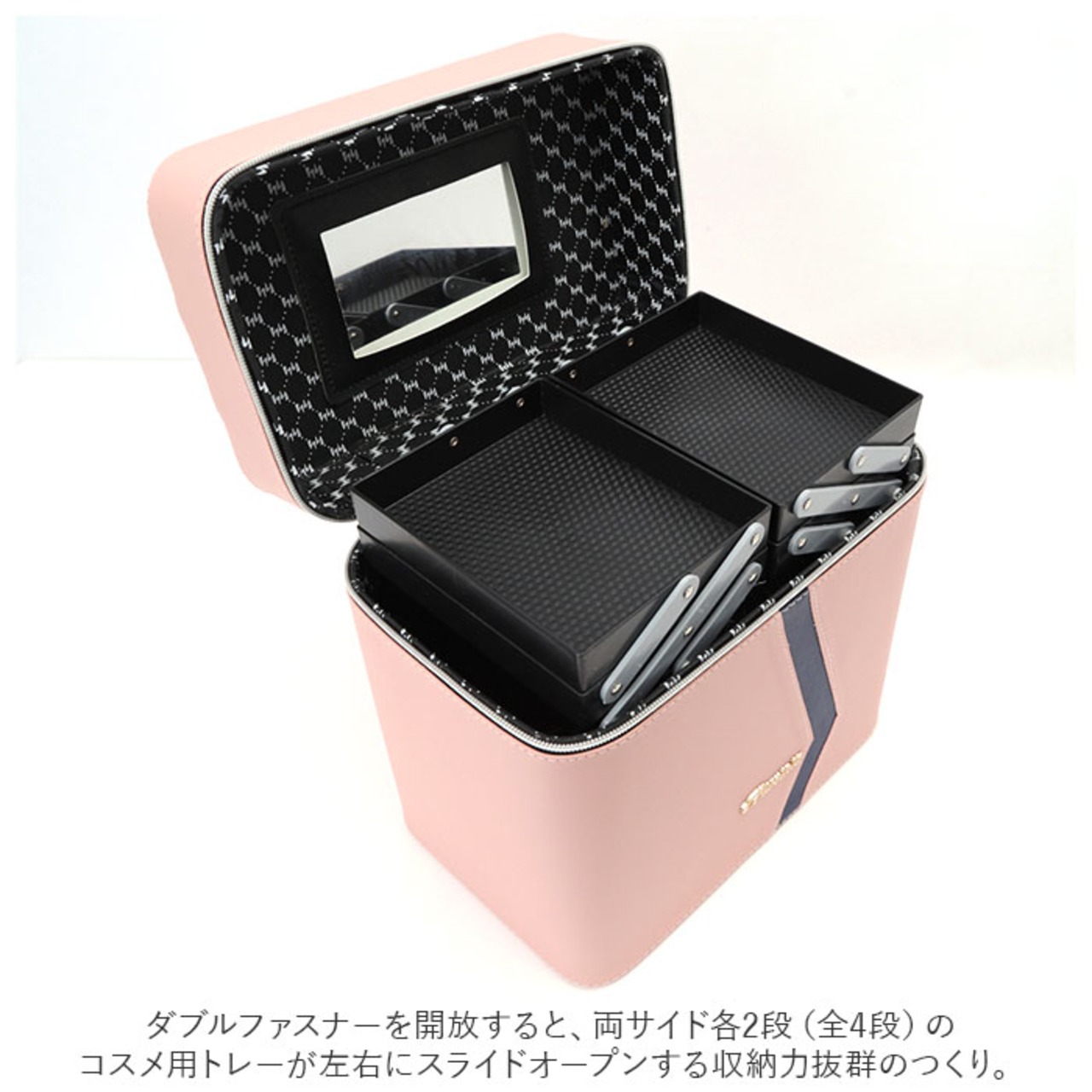 ・メイクアップアーティスト顔負けのプロ仕様!ダブルファスナーを開放すると、両サイド各2段(全4段)のコスメ用トレーが左右にスライドオープンする収納力抜群のつくり。