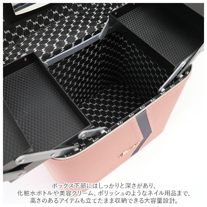 ・ボックス下部にはしっかりと深さがあり、化粧水ボトルや美容クリーム、ポリッシュのようなネイル用品まで、高さのあるアイテムも立てたまま収納できる大容量設計。