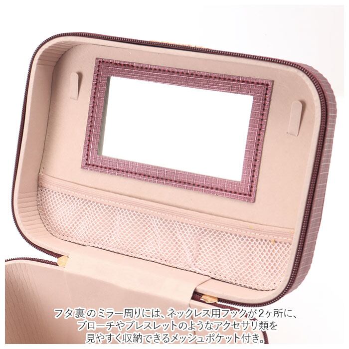 ・フタ裏のミラー周りには、ネックレス用フックが2ヶ所に、ブローチやブレスレットのようなアクセサリ類を見やすく収納できるメッシュポケット付き。