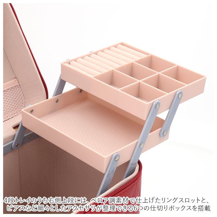 4段トレイのうち右側上段には、ベロア調素材で仕上げたリングスロットと、ピアスなど細々としたアクセサリが整理できる6つの仕切りボックスを搭載。