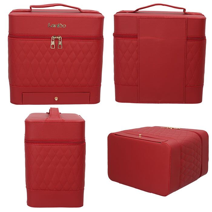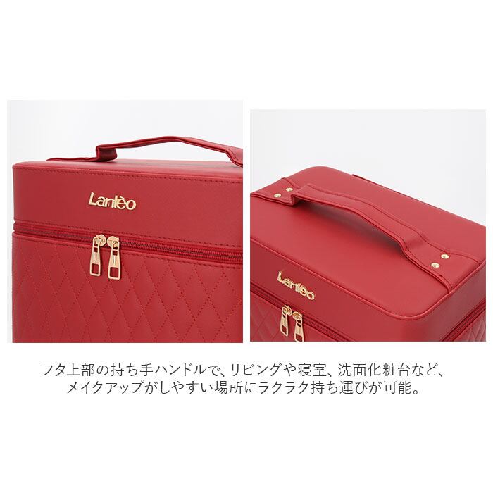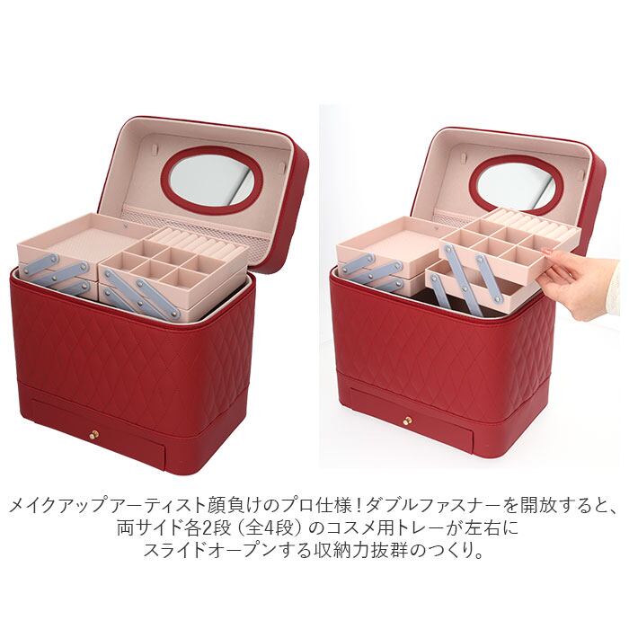 ・メイクアップアーティスト顔負けのプロ仕様!ダブルファスナーを開放すると、両サイド各2段(全4段)のコスメ用トレーが左右にスライドオープンする収納力抜群のつくり。