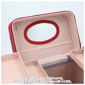 ・フタ裏には便利なミラー付きなので、一人暮らしのお部屋でも、このコスメボックスを広げればどこでもドレッサーに早変わり!ミラー周りには、ネックレス用フック×2、アクセサリを見やすく収納できるメッシュポケット付き。