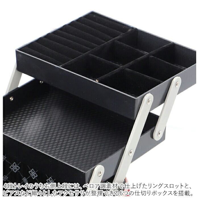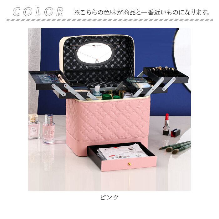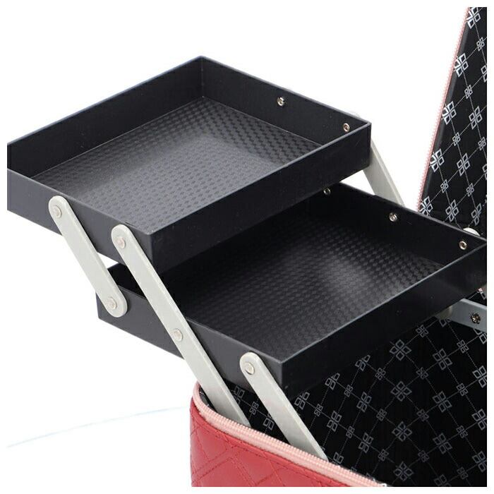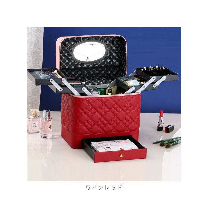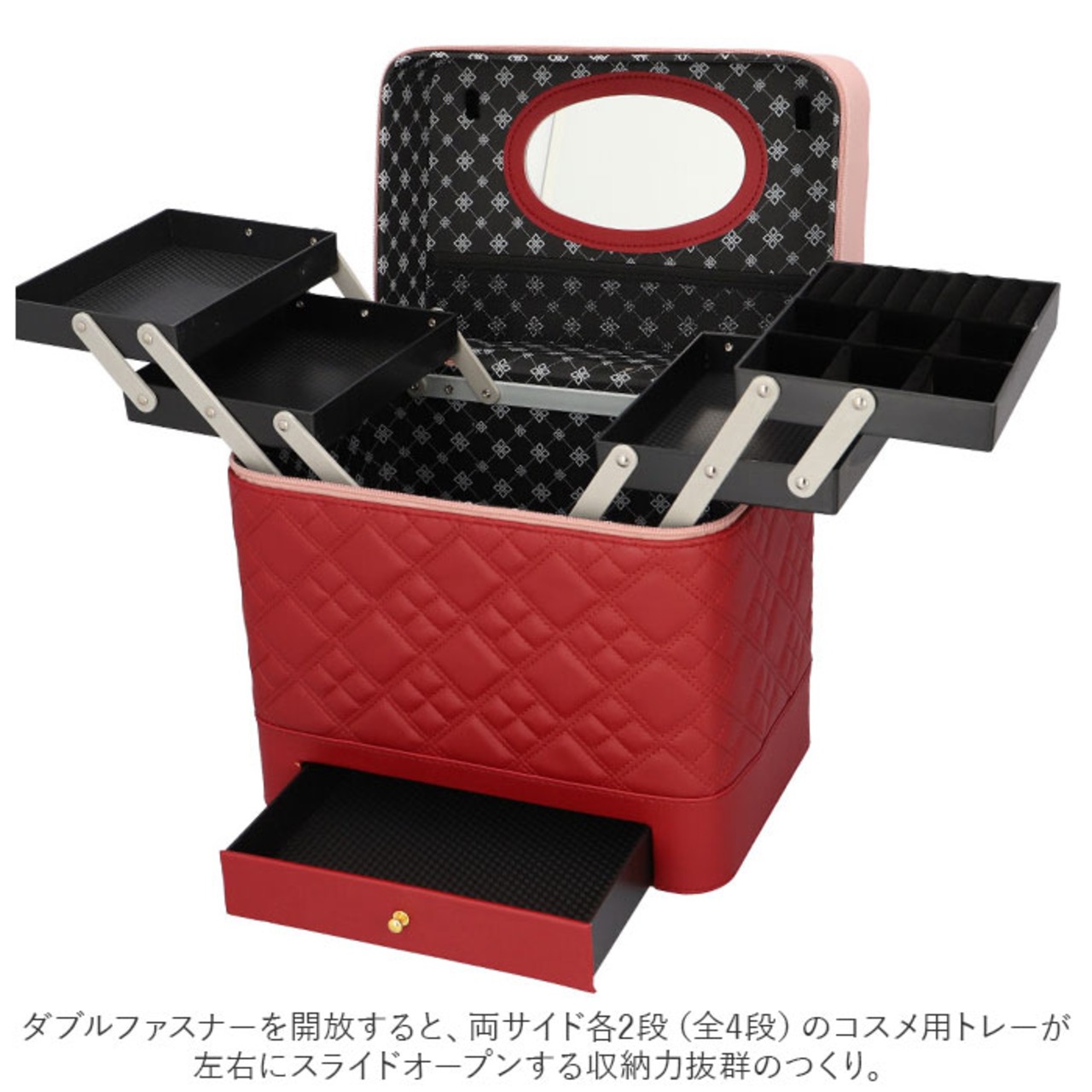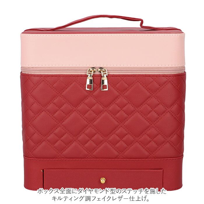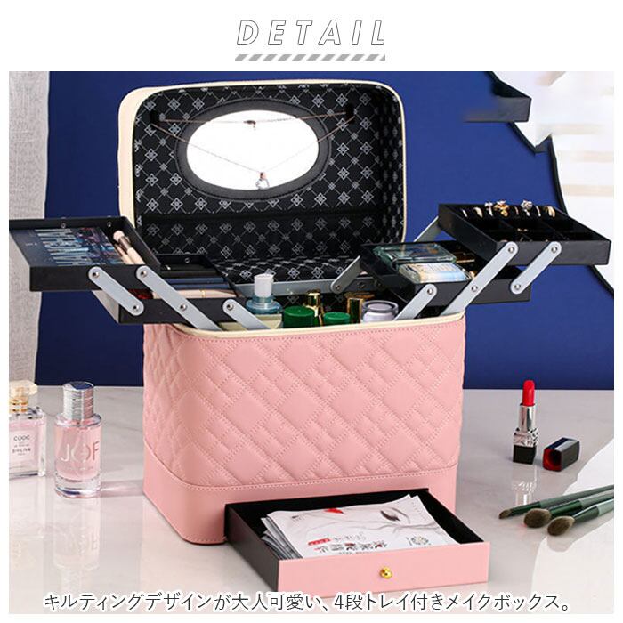 ・左右に立体的に広がる、4段トレイ付き♪キルティングデザインが大人可愛い、トレイ付きメイクボックス。