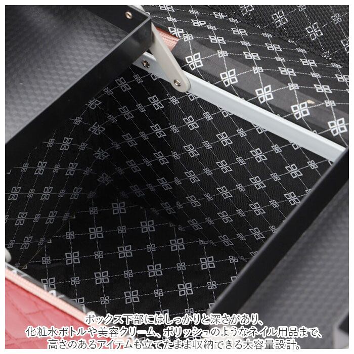 ・ボックス下部にはしっかりと深さがあり、化粧水ボトルや美容クリーム、ポリッシュのようなネイル用品まで、高さのあるアイテムも立てたまま収納できる大容量設計。