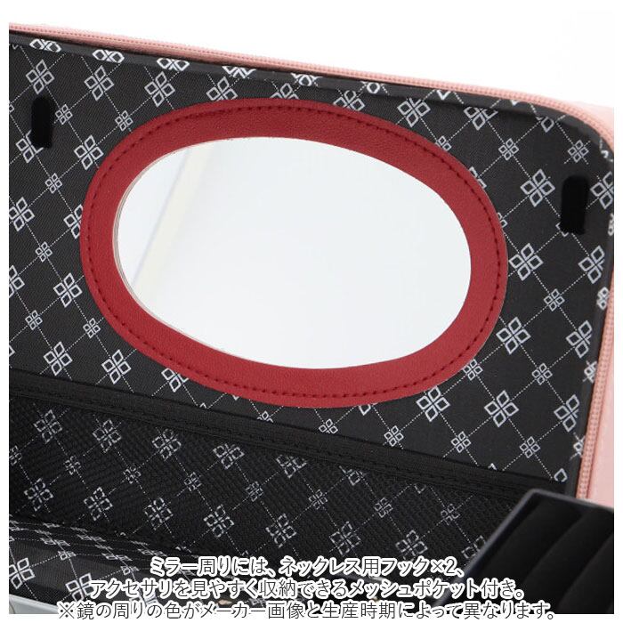・フタ裏には便利なミラー付きなので、一人暮らしのお部屋でも、このコスメボックスを広げればどこでもドレッサーに早変わり!ミラー周りには、ネックレス用フック×2、アクセサリを見やすく収納できるメッシュポケット付き。