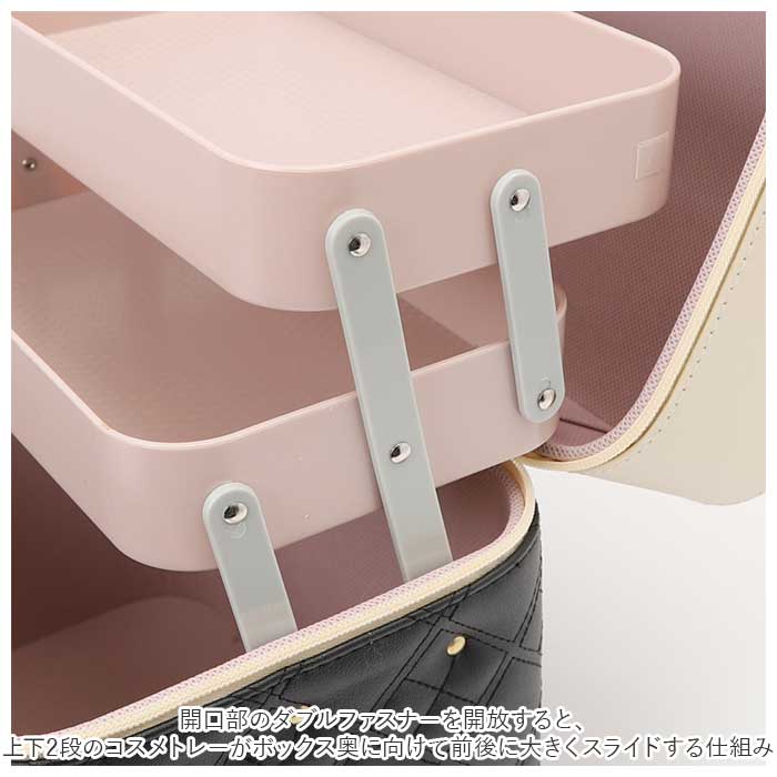 ・開口部のダブルファスナーを開放すると、上下2段のコスメトレーがボックス奥に向けて前後に大きくスライドする仕組み。