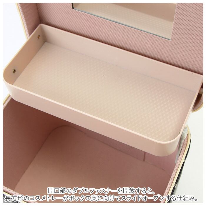 ・開口部のダブルファスナーを開放すると、長方形のコスメトレーがボックス奥に向けてスライドオープンする仕組み。