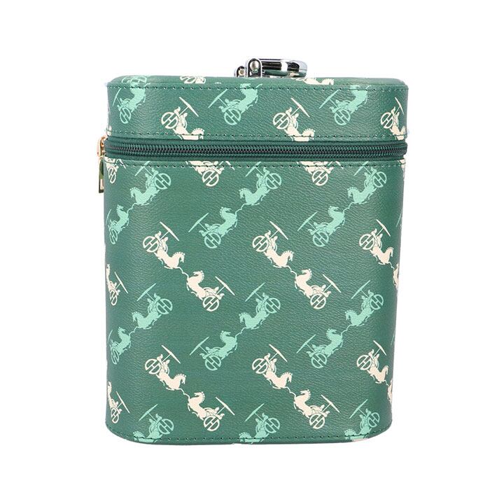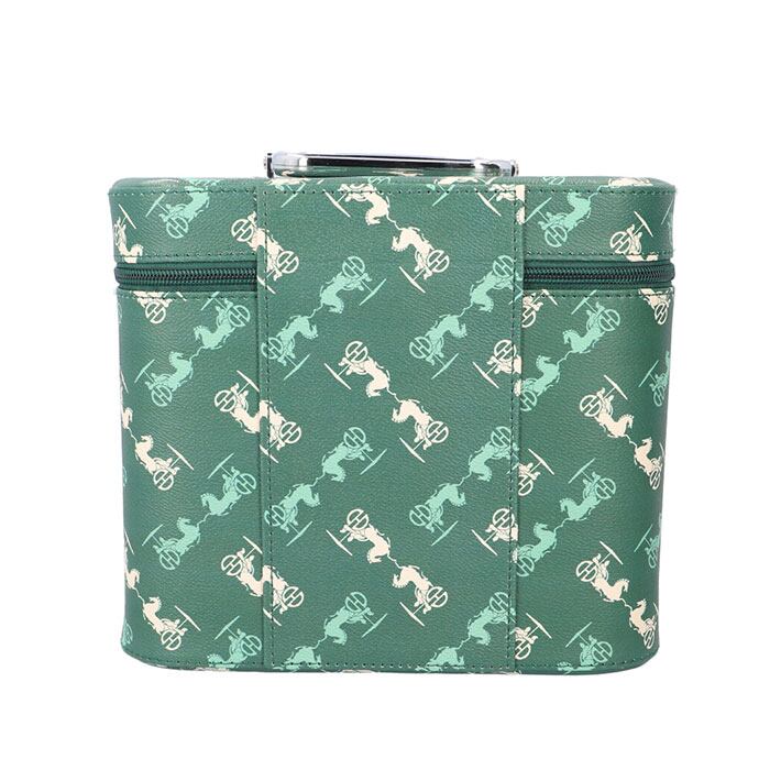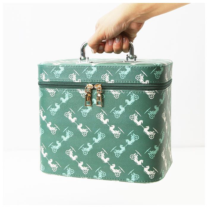 ・エメラルドグリーンのフェイクレザーに馬車の紋様を施した個性的なデザイン。汚れや水滴がサッと拭き取れる、お手入れのしやすさも魅力のひとつ。