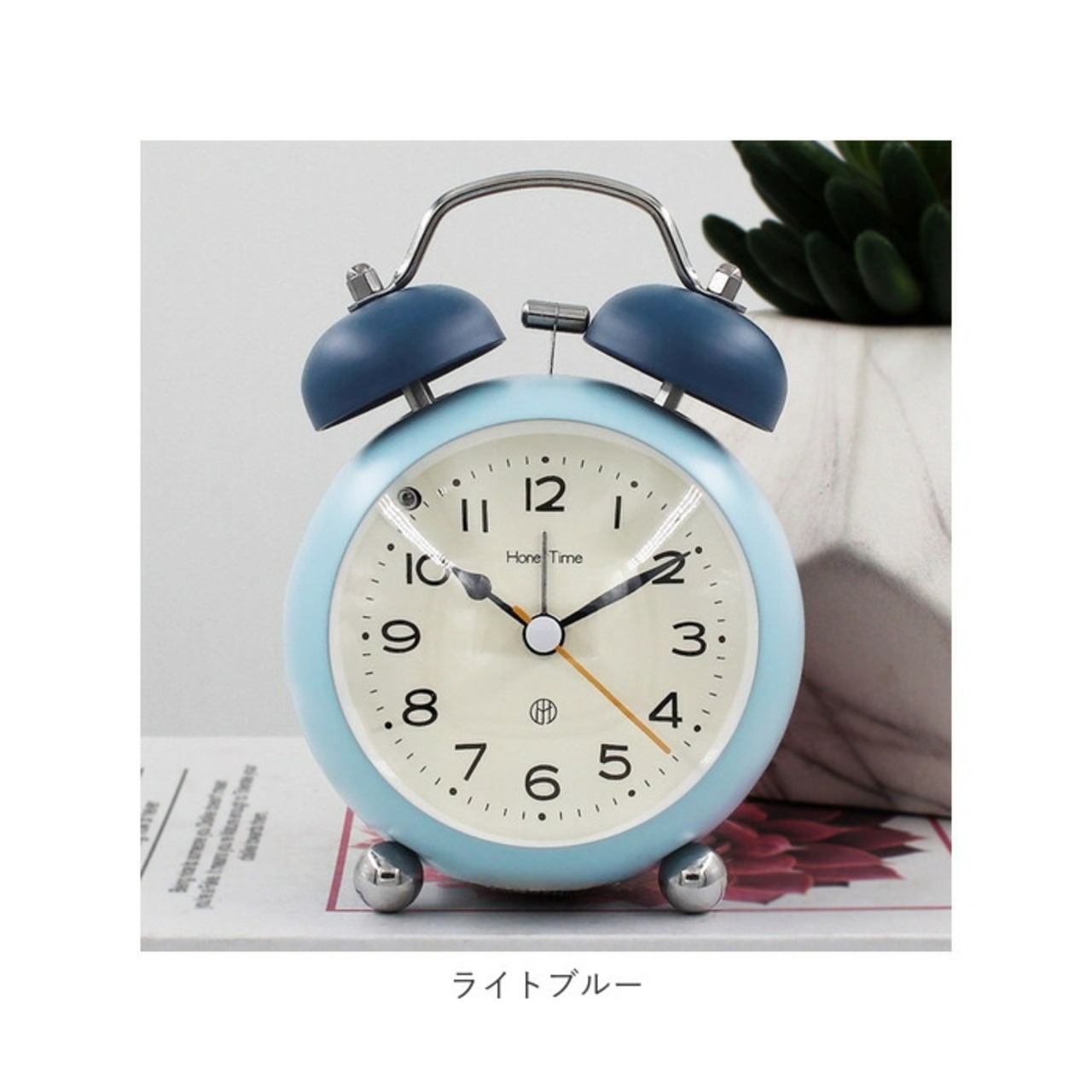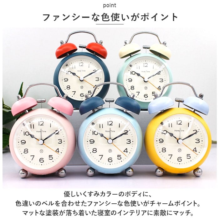 ・優しいくすみカラーのボディに、色違いのベルを合わせたファンシーな色使いがチャームポイント。マットな塗装が落ち着いた寝室のインテリアに素敵にマッチ。