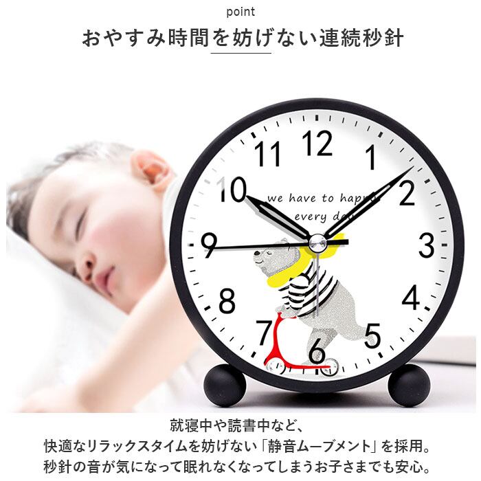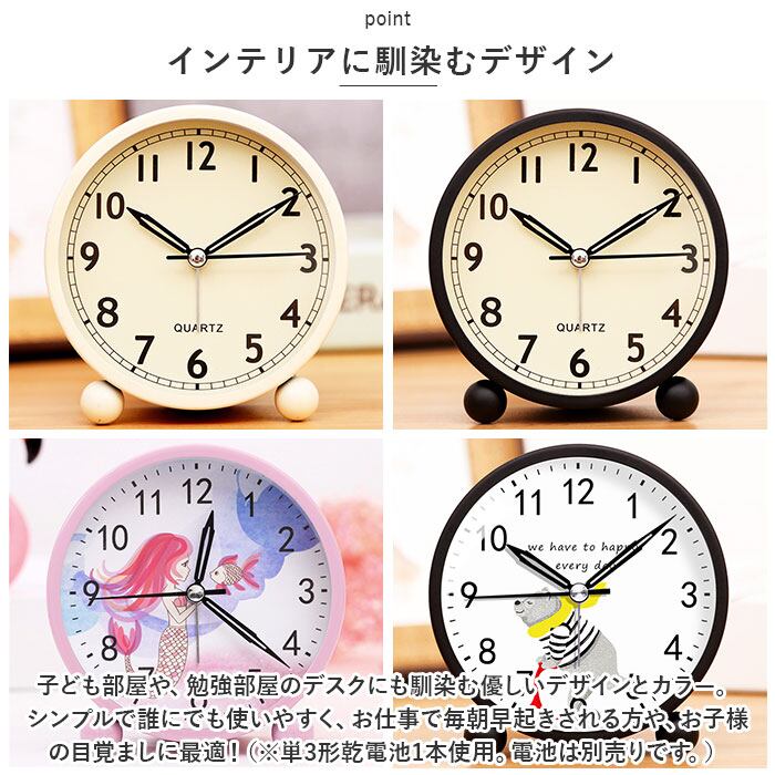 ・子ども部屋や、勉強部屋のデスクにもすっきり馴染む優しいデザインとカラー。シンプルで誰にでも使いやすく、お仕事で毎朝早起きされる方や、お子さまの目覚まし用に最適!(※単3形乾電池1本使用。電池は別売りです。)