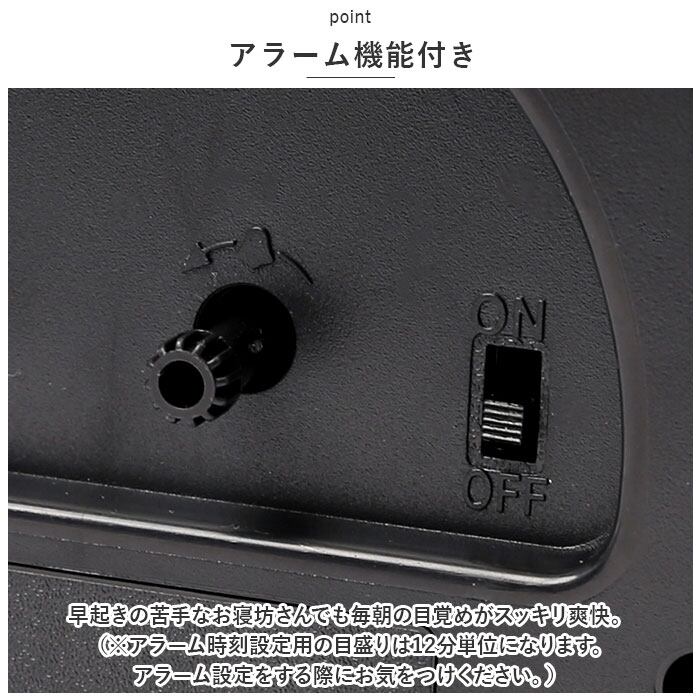 ・早起きの苦手なお寝坊さんでも毎朝の目覚めがスッキリ爽快。(※アラーム時刻設定用の目盛りは12分単位になります。アラーム設定をする際にお気をつけください。)
