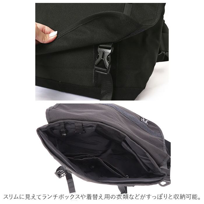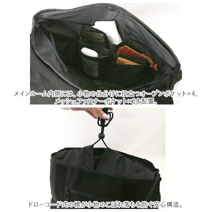 ・バッグの開口部は、バックル式フラップ+面ファスナーの2重クローズ方式に、ドローコード式の幌が小物のこぼれ落ちを防ぐ安心構造。