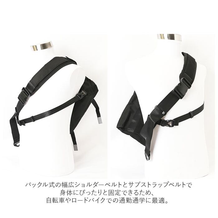 ・バックル式の幅広ショルダーベルトとサブストラップベルトで身体にぴったりと固定できるため、自転車やロードバイクでの通勤通学に最適。