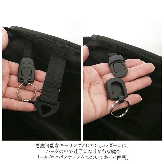 ・着脱可能なキーリングとDカンホルダーには、バッグの中で迷子になりがちな鍵やリール付きパスケースをつないでおくと便利。