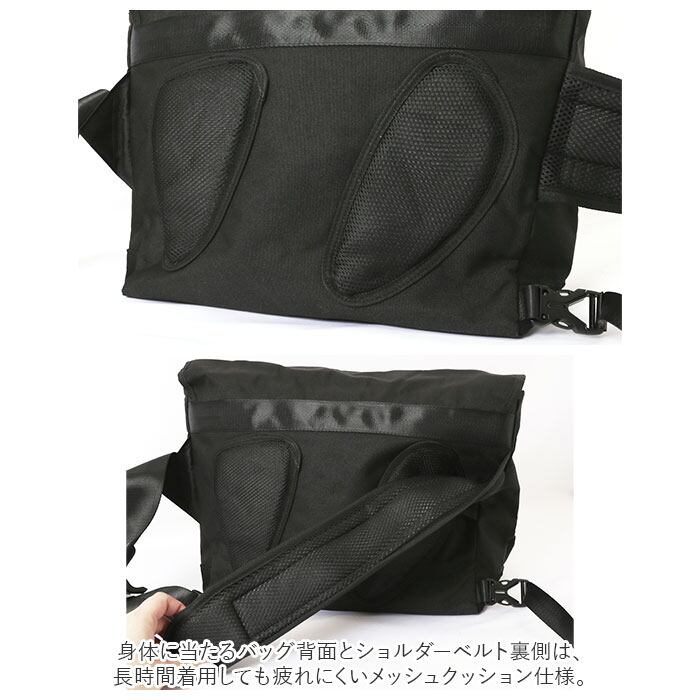・身体に当たるバッグ背面とショルダーベルト裏側は、長時間着用しても疲れにくいメッシュクッション仕様。