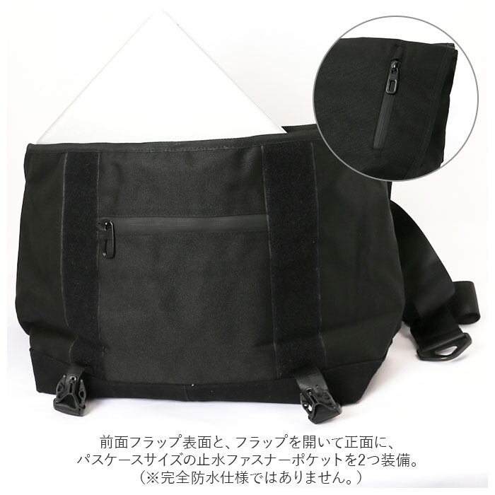 ・前面フラップ表面と、フラップを開いて正面に、出番の多い小物がサッと取り出せるパスケースサイズの止水ファスナーポケットを2つ装備。(※完全防水仕様ではありません。)