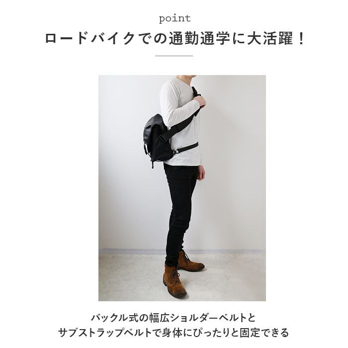 ・バックル式の幅広ショルダーベルトとサブストラップベルトで身体にぴったりと固定できるため、自転車やロードバイクでの通勤通学に大活躍!