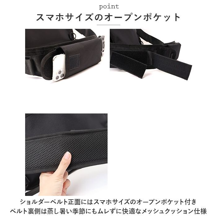 ・ショルダーベルト正面にはスマホサイズのオープンポケット付き。ベルト裏側は蒸し暑い季節にもムレずに快適なメッシュクッション仕様。