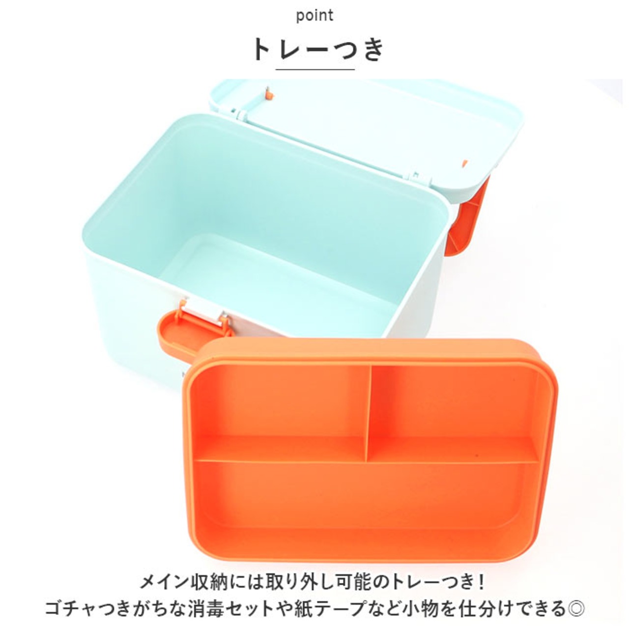 ・メイン収納には取り外し可能のトレーつき!ゴチャつきがちな消毒セットや紙テープなど小物を仕分けできるので、スッキリ整理整頓ができる◎