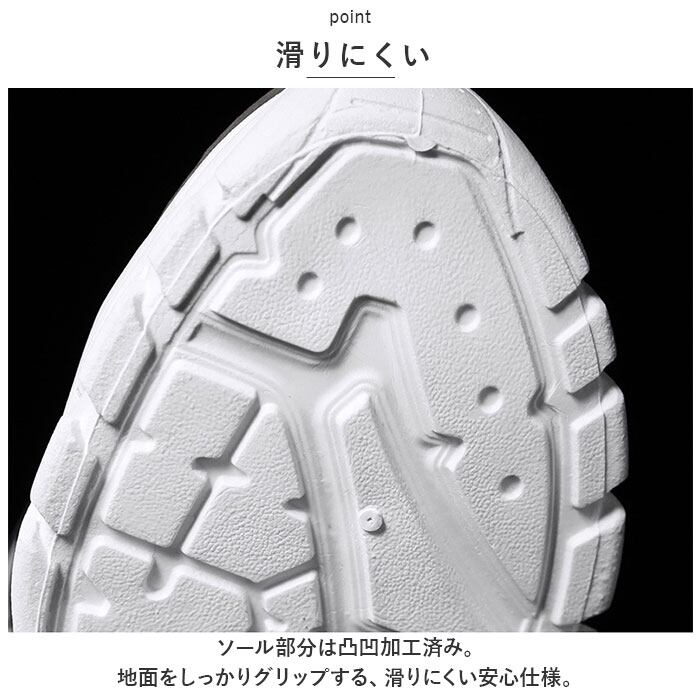 ・ソール部分は凸凹加工済み。地面をしっかりグリップする、滑りにくい安心仕様。