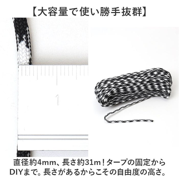 ・直径約4mm、長さ約31m!タープの固定からDIYまで。長さがあるからこその自由度の高さ。