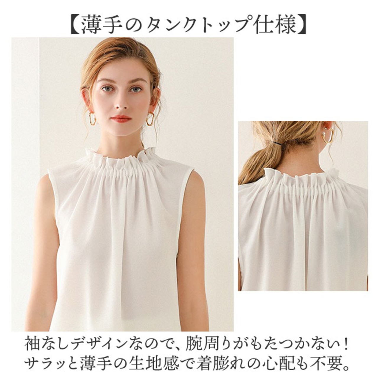 ・袖なしデザインなので、腕周りがもたつかない!サラッと薄手の生地感で着膨れの心配も不要。