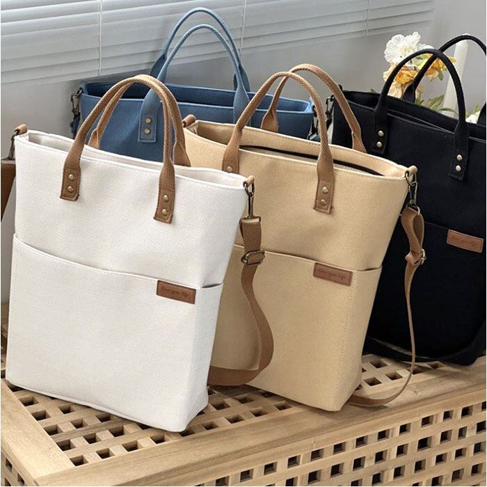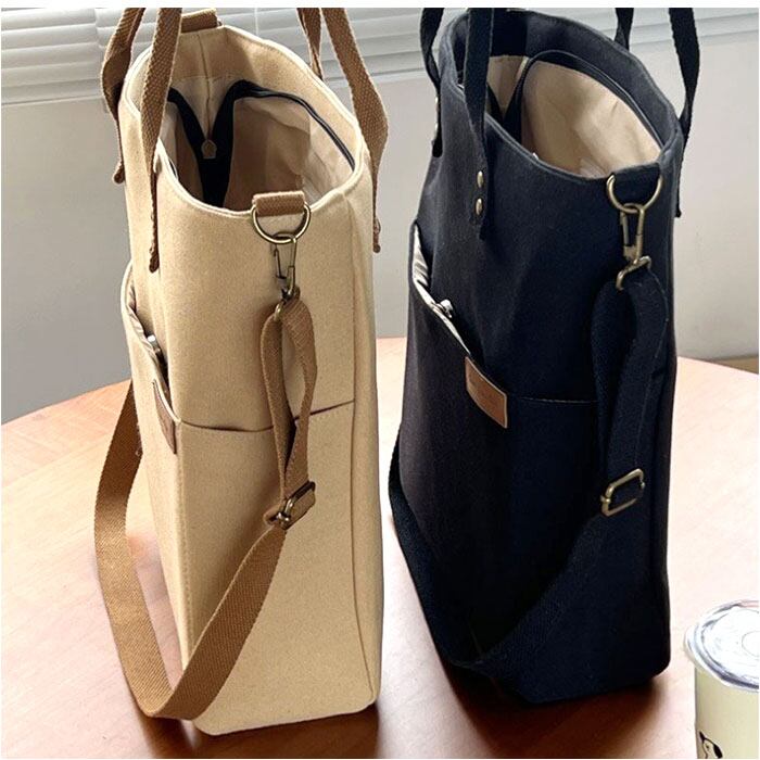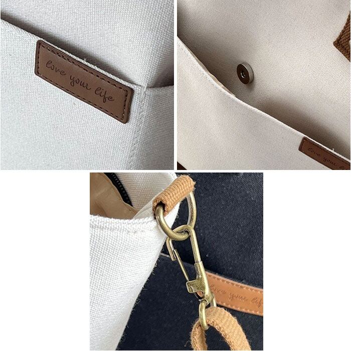 ・自然な風合いで手軽に持てるキャンバス生地。タグやアンティークカラーの金具がアクセント。