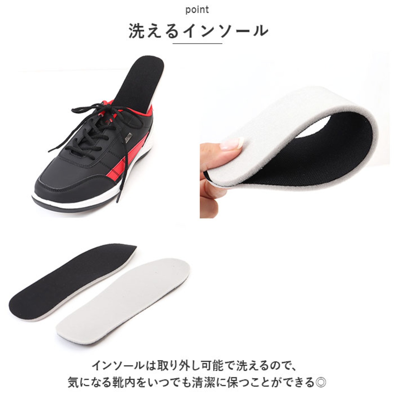 ・インソールは取り外し可能で洗えるので、気になる靴内をいつでも清潔に保つことができる◎