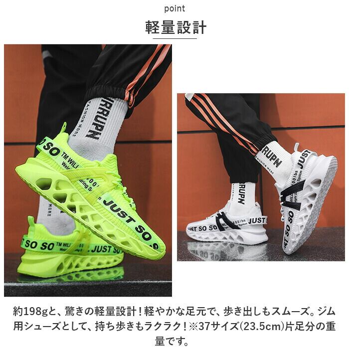 ・約198gと、驚きの軽量設計!軽やかな足元で、歩き出しもスムーズ。ジム用シューズとして、持ち歩きもラクラク!