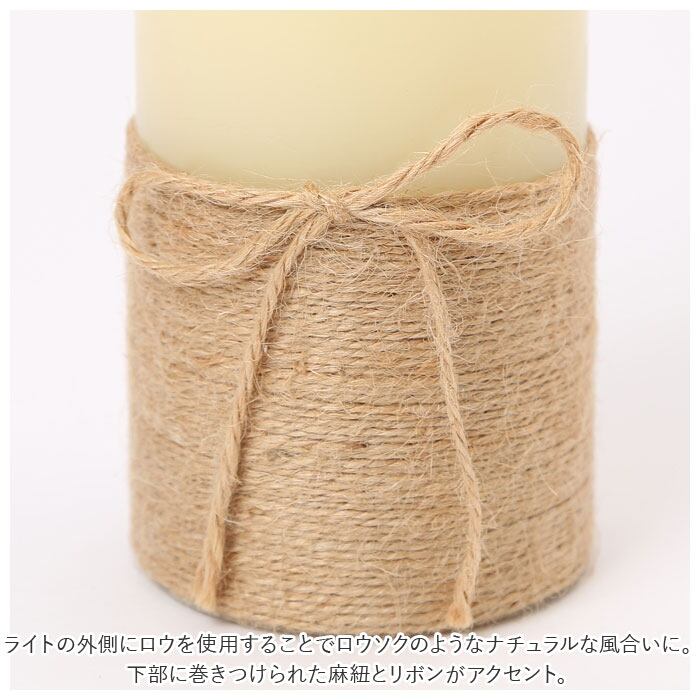 ・ライトの外側にロウを使用することでロウソクのようなナチュラルな風合いに。下部に巻きつけられた麻紐とリボンがアクセント。