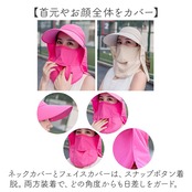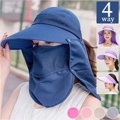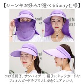 ・つば広帽子、サンバイザー、帽子にネックガードやフェイスガードをプラスし4通りにアレンジ。