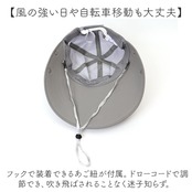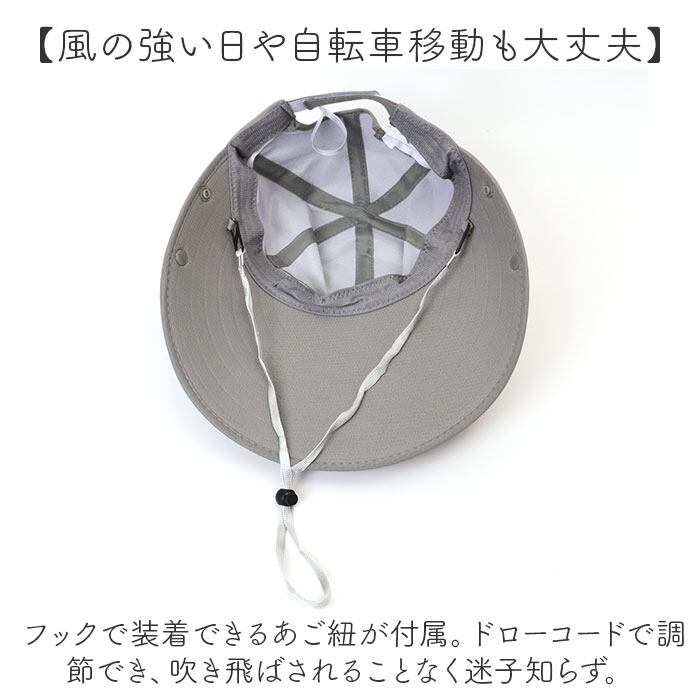 ・フックで装着できるあご紐が付属。ドローコードで調節でき、吹き飛ばされることなく迷子知らず。