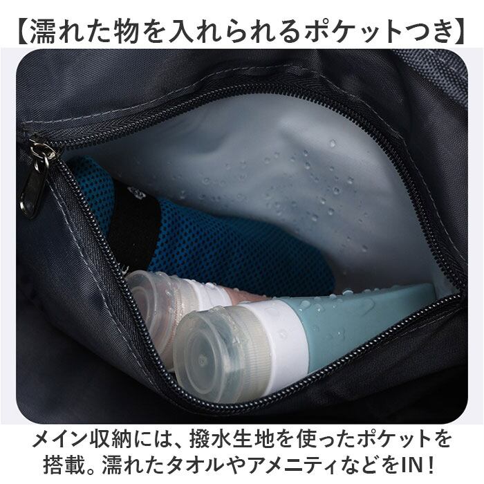 ・メイン収納には、撥水生地を使ったポケットを搭載。濡れたタオルやアメニティなどをIN!