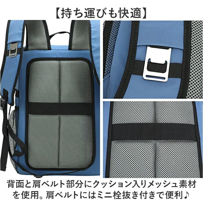 ・背面と肩ベルト部分にクッション入りメッシュ素材を使用。肩ベルトにはミニ栓抜き付きで便利♪
