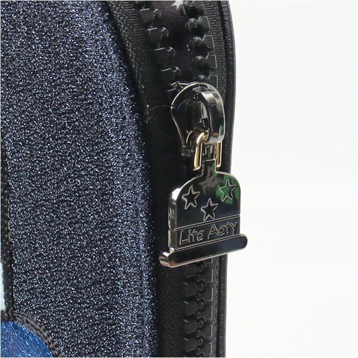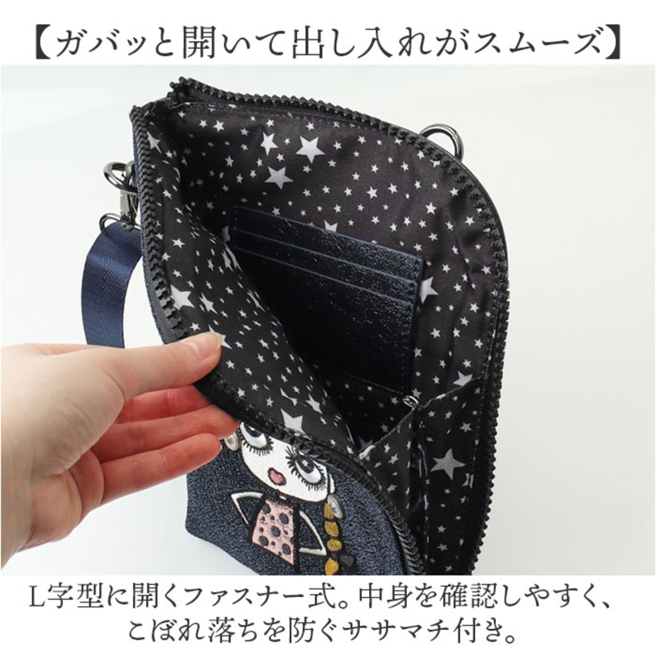 ・L字型に開くファスナー式。中身を確認しやすく、こぼれ落ちを防ぐササマチ付き。